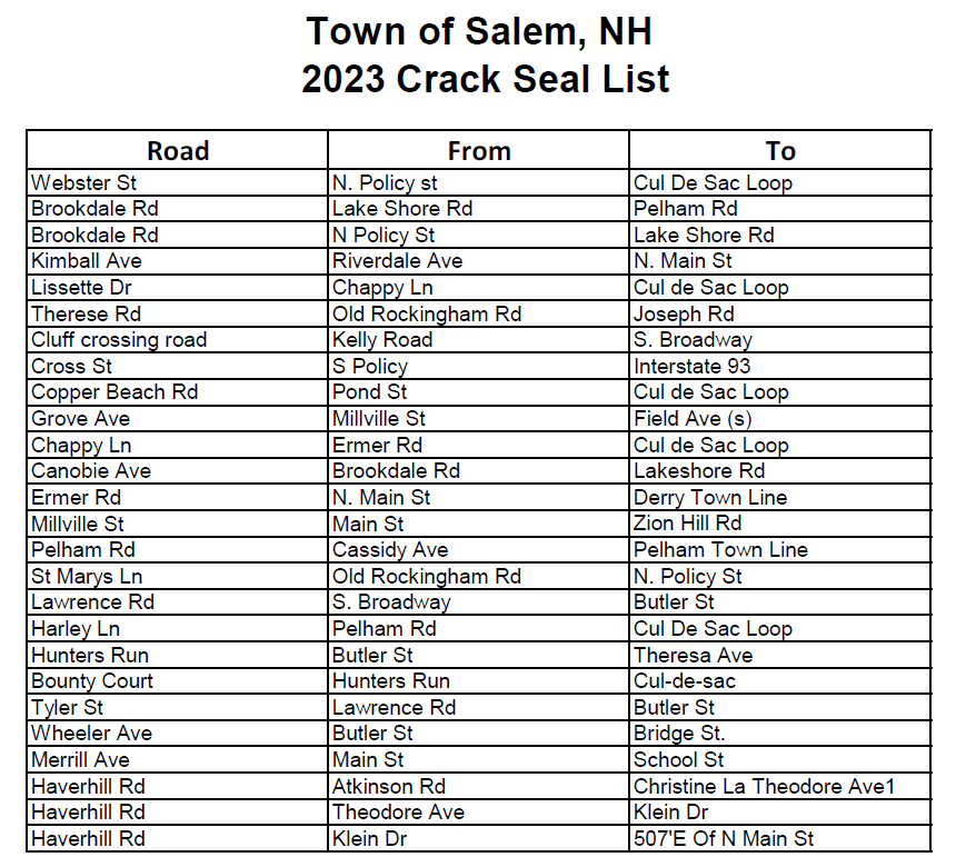 Town wide crack sealing is scheduled to begin the week of June 2, 2024 and last approximately 3 weeks.